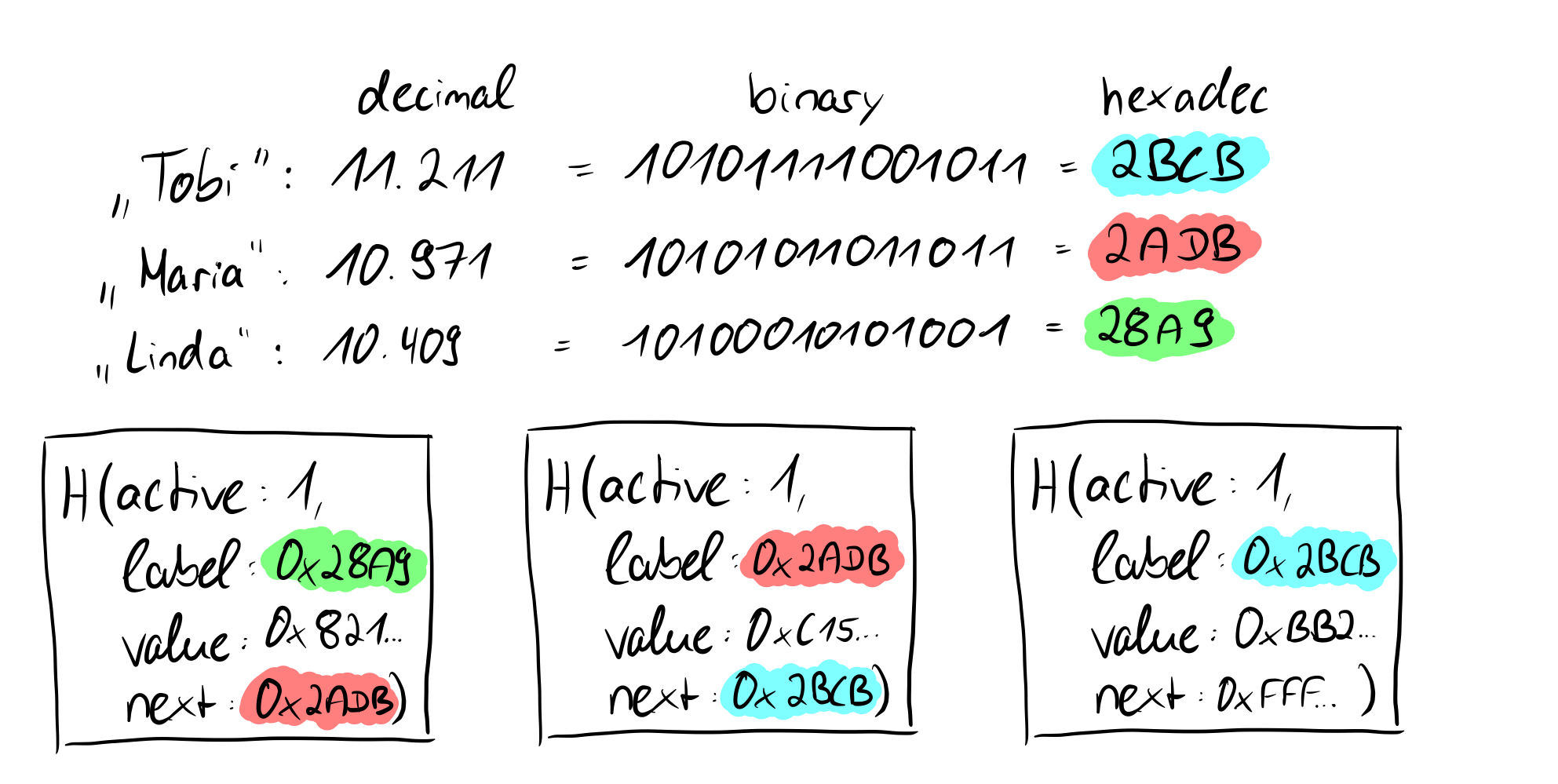 We recall that in Verdict the leaves consist of the hash of the quadruple < active, label, value, next >. Verdict has a label, the identifier hashed with SHA256 from the label value map, in addition to the active flag. When hashing a string with SHA256, a 256 bit or 32 byte value will come out. The 256 binary bits or 32 bytes in hexadecimal can also be converted to decimal as shown earlier in the picture using a simplified example with small numbers, in which system the sorting is familiar to us. So we know that we can turn any document, string or whatever with SHA256 into a representation of a fixed length string, namely 256 bits (32 bytes). So not only does SHA256 give us the advantage that the cryptographic commits and the values within a leaf node are always the same length, but it also gives us comparable or rather sortable numbers. Now it also makes a bit more sense why in the construction of Verdict the last node points to 64 "F"'s in hexadecimal or 256 "ones" in binary, this is, so to speak, the "highest possible number" and thus in a sense set as the "end".