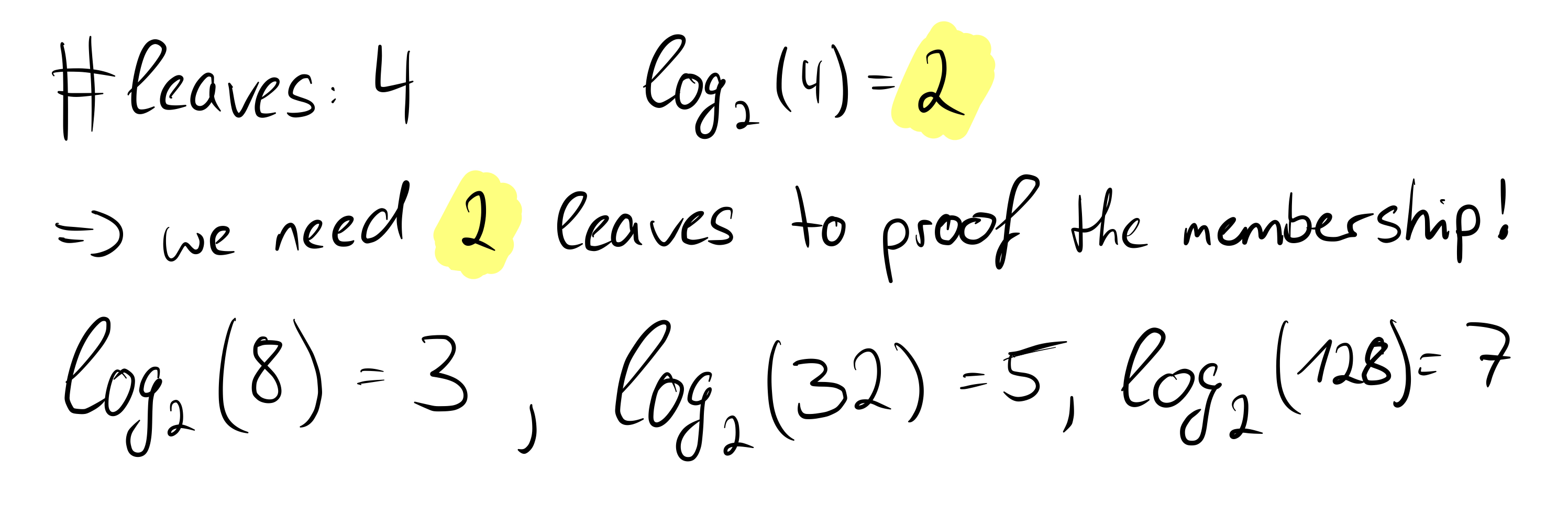 We see that in our example we actually need two leaves to prove the correctness of the root. Even if the number of leaves increases rapidly, with each further doubling only one more hash value is needed to prove the correctness of the root. This is an important and great property of Merkle trees and we can formally state: