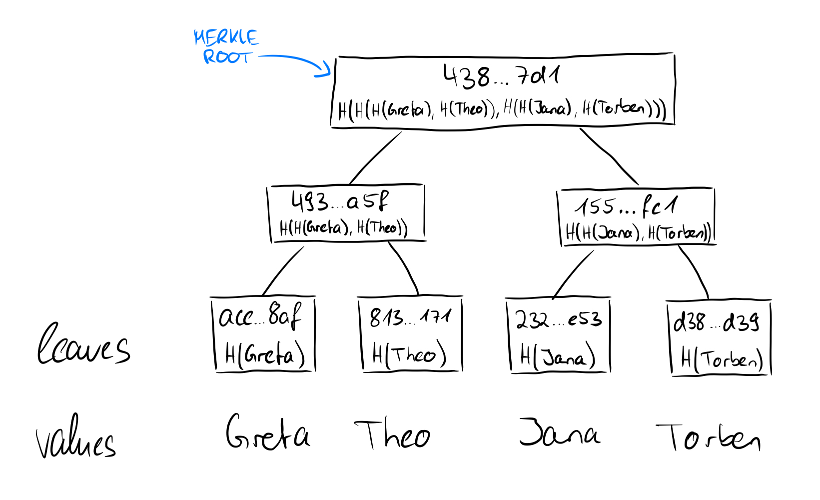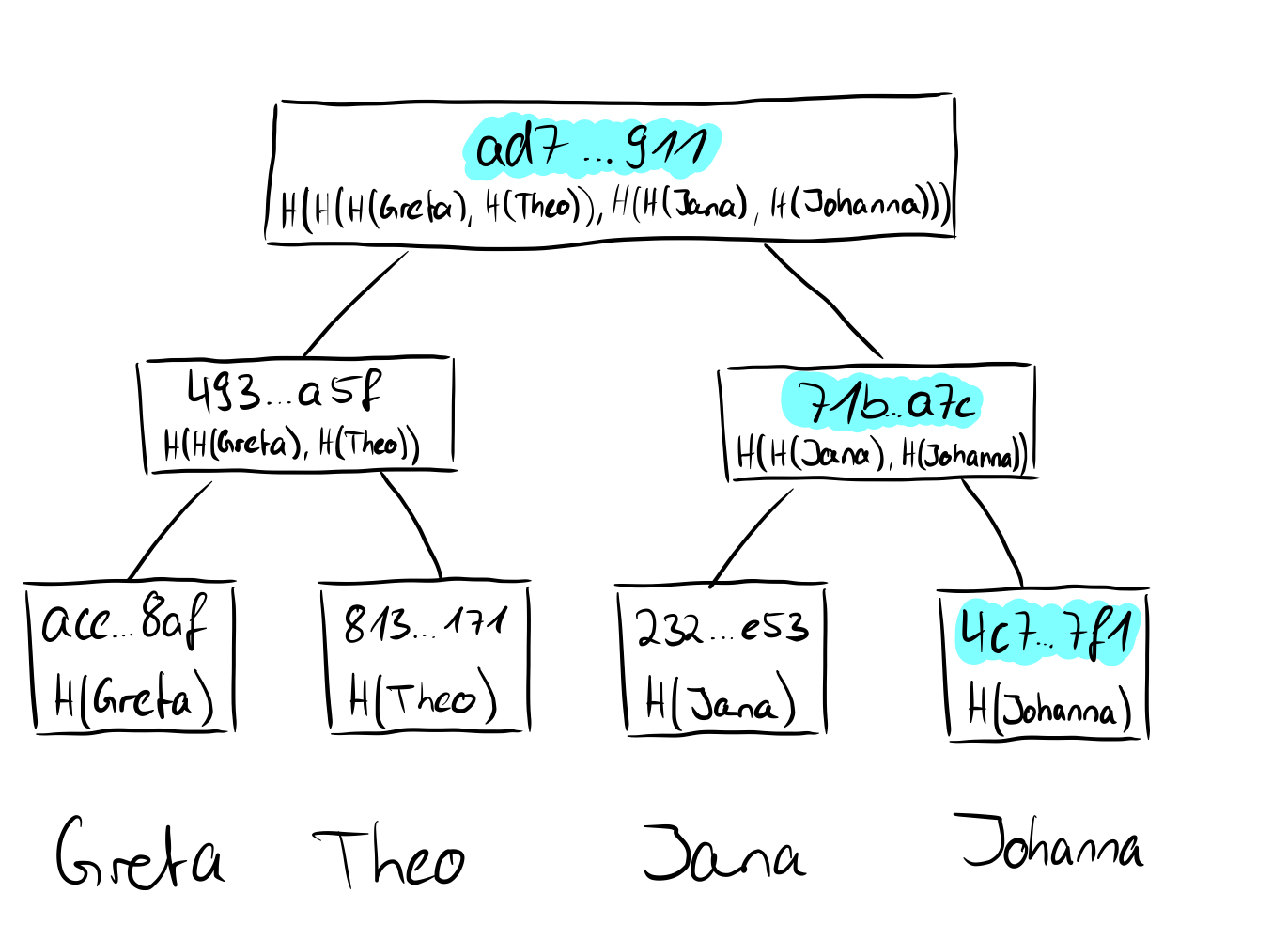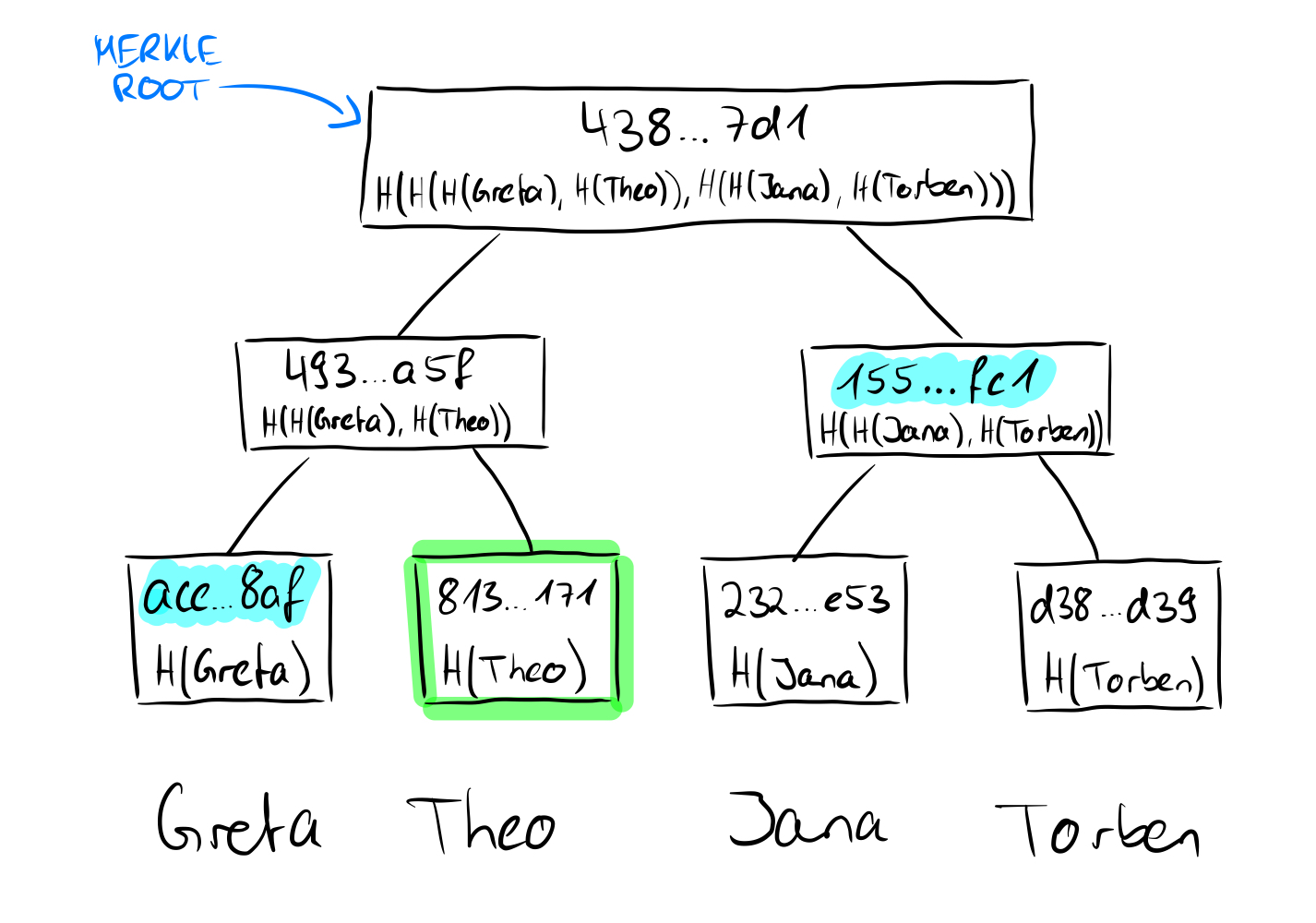 Here we want to prove that the value "Theo" is contained in the tree. Since we know the value and we know that the hashes are created using the SHA256 hash function, we can calculate the hash value of Theo on our own. We said that we need the non-computable sibling nodes on the way to the root, and we have no way to come up with the value "Greta" because we don't know the other leave values, just the hashes. In our proof, we need to provide the hash of the value "Greta" for a proof that the root is correct. Since we now have the hash values of "Greta" and "Theo", we can calculate the parent node of the two. Uncomputable on the other hand is now again the sibling node of the parent node of "Greta" and "Theo", which we must bring again in the proof. This node is at the same time for the tree with four leaves the last necessary node to show the correctness of the root, because we can now calculate the root with the calculated parent node of "Greta" and "Theo" as well as its sibling node. What may not look very powerful in this small example is very powerful for larger trees, because mathematically speaking we only need log n nodes instead of the number of nodes (n) to prove the correctness of the root of the Merkle tree.