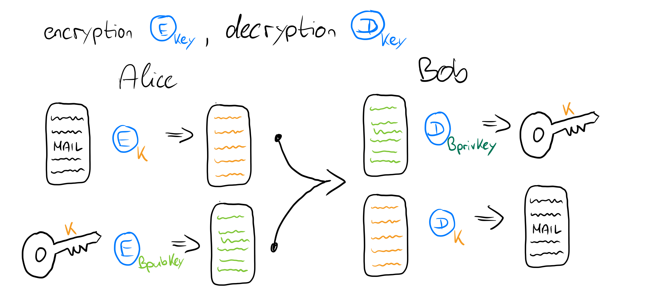 In cryptography, we often talk about two participants interacting with each other: Participant A and Participant B. Since A and B are somewhat impersonal, we'll call them Alice and Bob. Alice in our case wants to write an email to Bob and would like to encrypt this email. She knows that she can achieve secure encryption using different encryption methods. She chooses hybrid encryption and needs, among other things, a public key BpubKey from Bob. So she looks in the list of the untrusted service for Bob's E-Mail address and finds one of his public keys in the corresponding column. She encrypts the email with a symmetric key k and encrypts this key again with Bob's public key BpubKey. Then she sends both the encrypted mail Mk and the encrypted key Ck to Bob, and only because Bob has the private key BprivKey can he decrypt the key to decrypt the mail. This is illustrated again here.