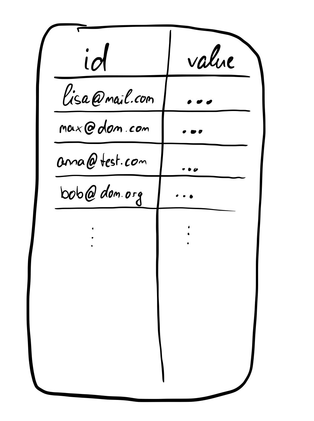 Let's first go a bit further into the functions of the service and how they are provided. So that we don't have to deal with an abstract idea in the following, Let's look at a concrete application example of Verdict. In the paper from Tzialla et al. "Keypal" is described as a concrete application example, which I will take up as a basis in the work and change in certain places or add approaches. For this reason, we will refer to the modified implementation described here as Deimos. We can think of Deimos as a service that manages a two-column table. The first column stores unique identifiers, namely e-mail addresses, and the corresponding column on the right also stores a list. In this list, public keys are stored (in a roundabout way, more about this later). To illustrate this, let's go through the whole thing again slowly with a use case.